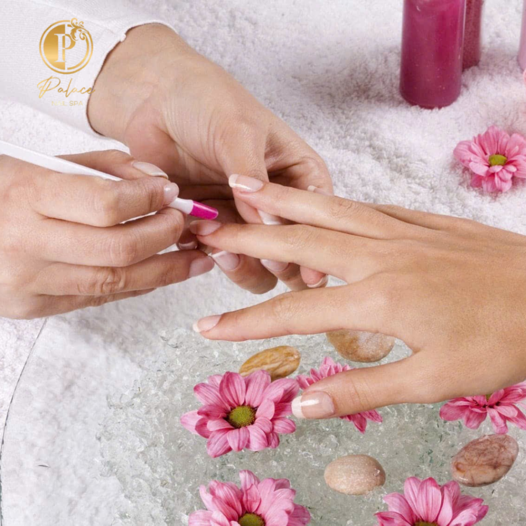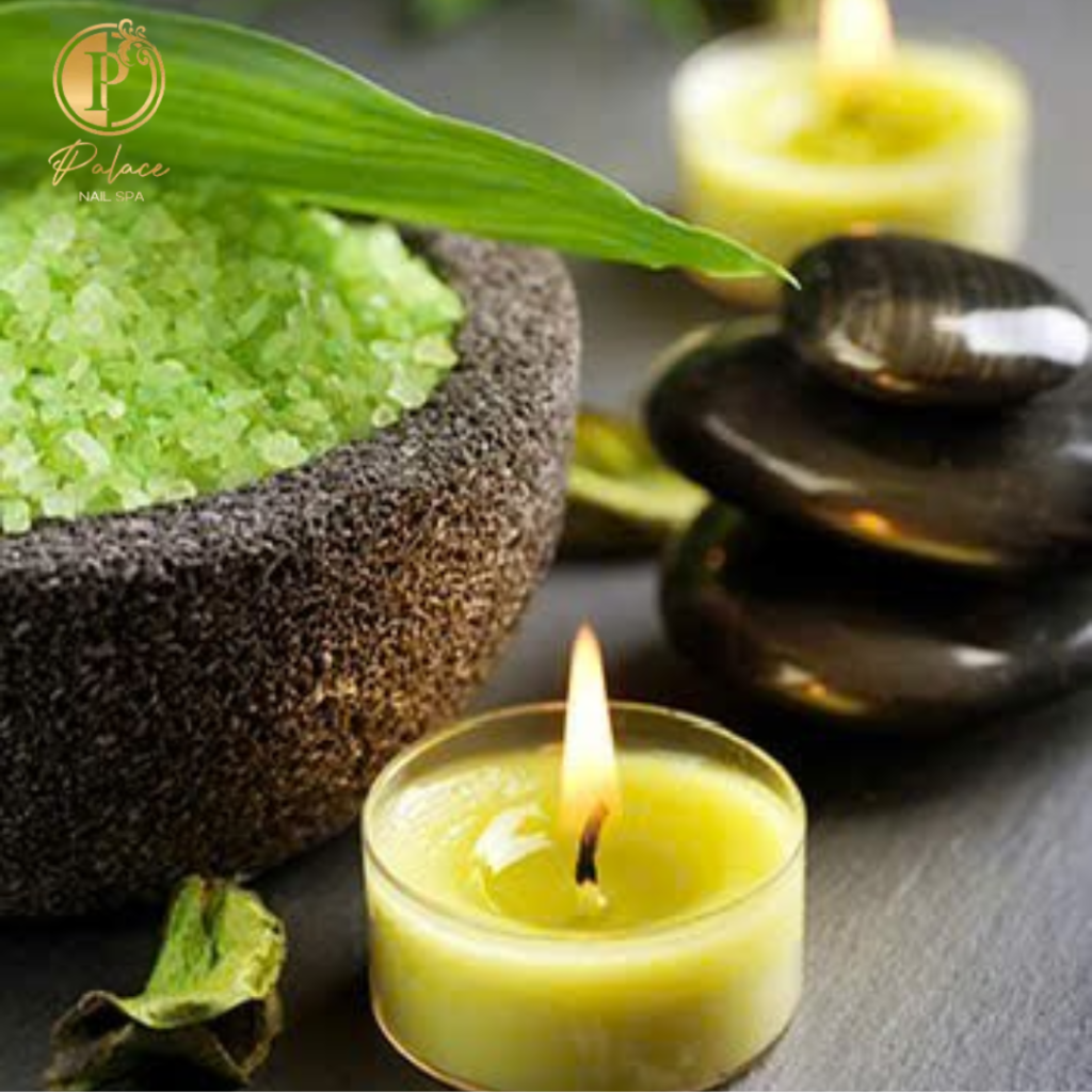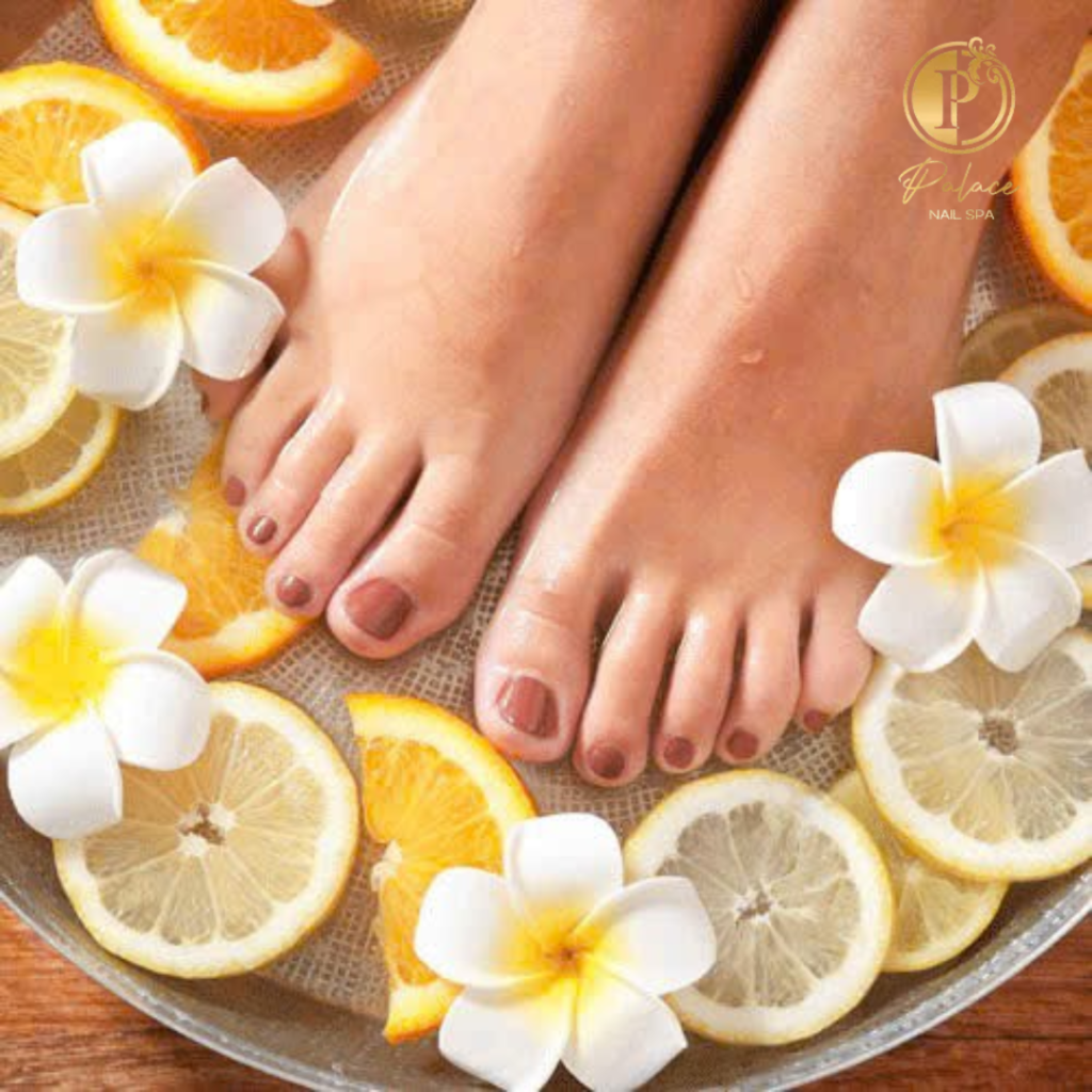 Enjoy a soothing foot soak! Champagne oil is used for the legs and feet after the regular routine of trimming cuticles and cleaning and shaping nails.